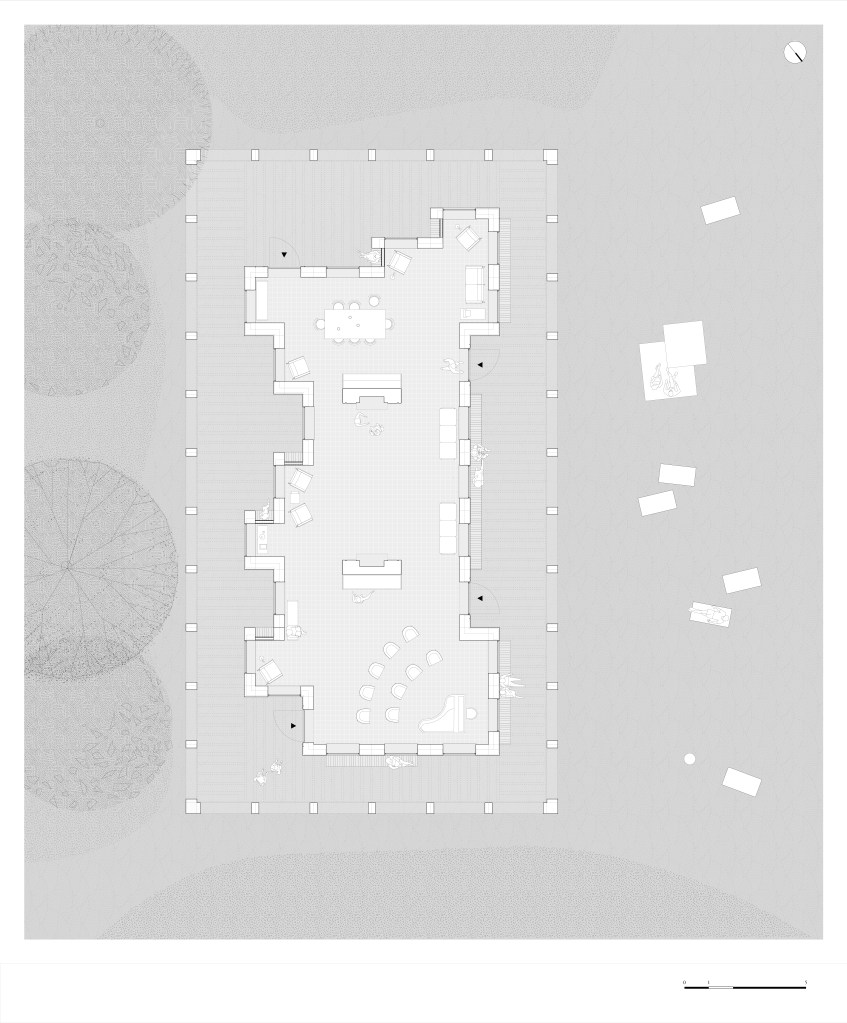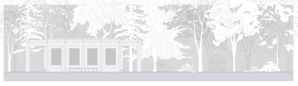 14th hectare garden can be clearly divided into two parts : the part that was set a park and a part that resembles a forest. The border between the different natural atmospheres is clear, it does not fade away gradually. The pavilion has been located on the border of two. This creates special qualities that enable for the pavilion to have two different faces and create a variety of spatial arrangements. Two opposite sites of the pavlion respond differently to the existing conditions of the opposite sides of the natural border, creating variations of spaces that address different activities.